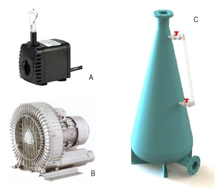 Diferentes sistemas de aireación empleados en acuicultura: A. Bombas de agua, B. Blowers o compresores, C. Conos de inyección de oxígeno puro.