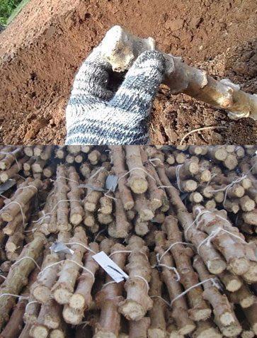 En la cosecha manual, la primera etapa comprende el corte y la selección del follaje y de la semilla. Se deja solo una parte del tallo de 20-40 cm de longitud adherida a las raíces para extraerlas más fácilmente del suelo. La segunda etapa comprende la extracción de las raíces, mediante el pulso, en terrenos flojos o palancas con apoyo al piso y va acompañada de la recolección, la limpieza y el empaque de las mismas, generalmente en sacos de 50 kg.