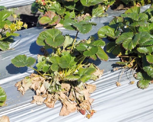 Los organismos causantes de enfermedades de planta incluyen a hongos, bacterias, nematodos, y virus. Si estos organismos están presentes, entonces la manipulación del ambiente y el huésped, para hacerlo menos susceptible, ayuda a manejar las enfermedades en las fresas, las cuales son altamente susceptibles a estas.