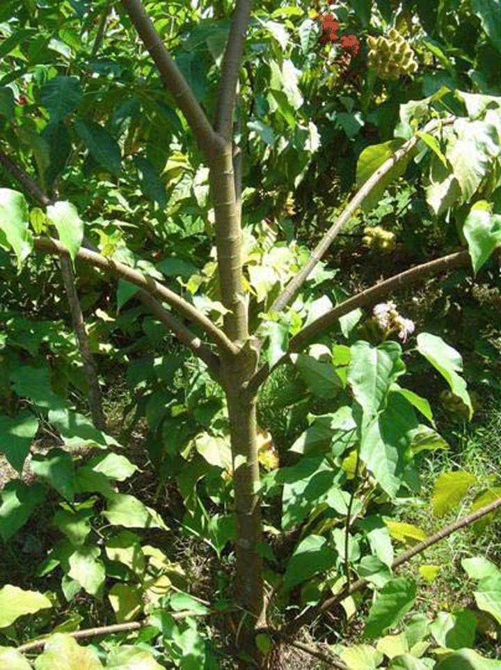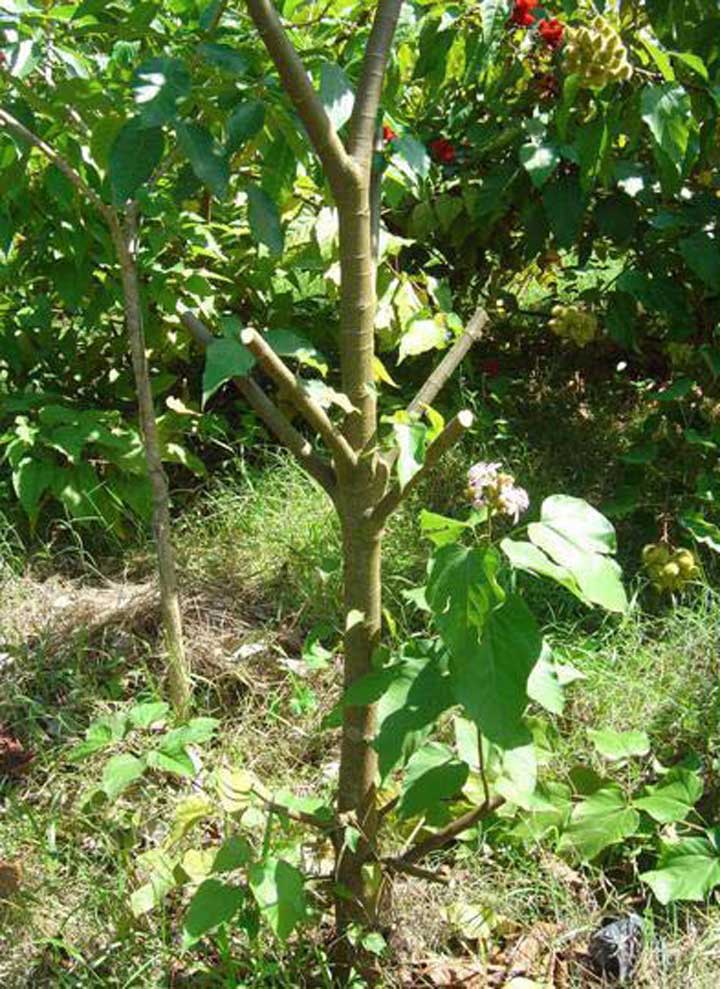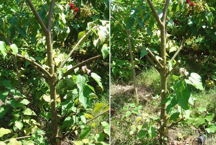 Árbol de onoto sin podar y con poda de formación. Fuente: Manual técnico El cultivo del achiote CNTAF.
