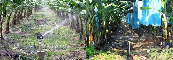 El sistema más efectivo y rendidor, se considera este último, que consiste en dos mangueras paralelas, perforadas cada 40 cm, tendidas a cada lado de la línea de bananos plantados, y sobre el camellón donde se encuentra instalado el cultivo.