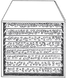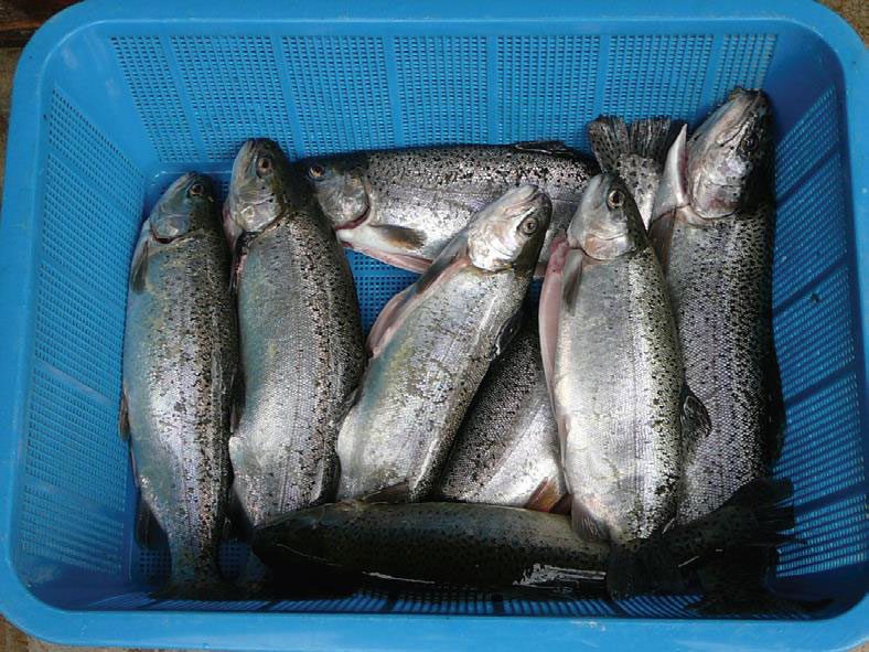 Si vamos a colocar truchas enteras en cajas, debe colocarse una capa de hielo de 5 cm de grueso en la parte inferior de la caja, seguida de una capa de truchas enteras, se agrega otra capa de hielo, y así sucesivamente, alternando hielo y pescado. La altura de almacenamiento no debe pasar de 45 centímetros.