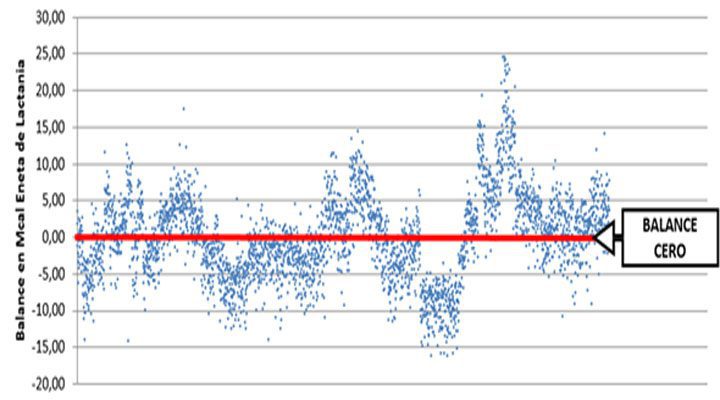 Entonces, cada punto azul representa la ubicación del suministro versus la oferta precisa (línea roja); también se presentan 90 días de medición (eje X) de un grupo de 45 vacas lecheras. Obsérvese qué tanto se alejan o acercan los puntos azules de la línea roja.