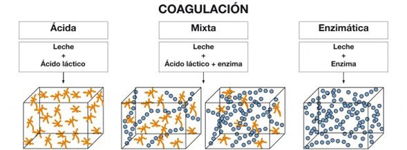 Existen dos tipos de coagulación básicas en el proceso de fabricación de queso, la ácida o láctica (que se emplea por ejemplo para la elaboración de requesón) y la enzimática (la que se emplea para elaborar queso).