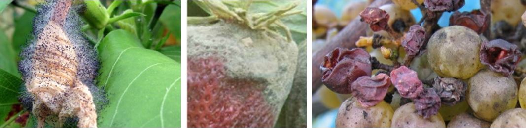 Es un hongo del filo Ascomycota; del latín botrys, que significa uva o racimo; y cinere que significa ceniza; causa dos efectos: podredumbre gris y podredumbre noble; este ayuda a producir algunos de los mejores vinos dulces del mundo. P. gris ataca a las plantas débiles o las flores moribundas de la vid; comienzan su desarrollo a través de restos de cosechas con el aumento de temperatura; y llegan a formar estructuras llamadas conidióforos, luego en sus extremos se forman los conidios para ser transportados a través del viento entrando en contacto con las hojas y tallos del cultivo. Al inicio se pueden apreciar unas manchas circulares que progresivamente aumentarán en número y tamaño; en el fruto produce pudriciones y lesiones grisáceas.