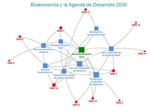 Entre los ODS en los que la bioeconomía influye, interviene directamente o permite avanzar significativamente están: Objetivo N° 2: Garantizar la salud y el bienestar. Objetivo N° 3: Asegurar agua limpia y saneamiento. Objetivo N° 6: Garantizar la disponibilidad de energía limpia y asequible. Objetivo N° 7: Crear nuevas fuentes de ingresos y empleo. Objetivo N° 8: Promover la innovación y la renovación industrial. Objetivo N° 9: Lograr la mayor sostenibilidad de las ciudades asentamientos y comunidades. Objetivo N° 11: Garantizar la producción y el consumo responsables. Objetivo N° 12: Impulsar la mitigación y adaptación al cambio climático. Objetivo N° 13: Conservar y aprovechar de mejor manera los recursos del mar. Objetivo N° 14: Promover la preservación de los ecosistemas terrestres, el uso sustentable de los bosques, la lucha contra la desertificación y degradación de tierras y la utilización sustentable de la biodiversidad. Objetivo N° 15: Impulsar el desarrollo de alianzas y asociaciones para el desarrollo.