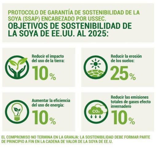 De tal manera que alineados con los objetivos globales, la soya sostenible de EE. UU. ha establecido metas para el 2025 a través de sus protocolos: