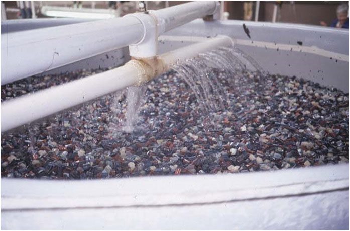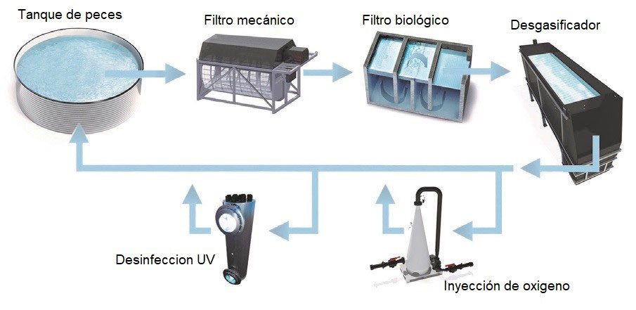 De modo que en estos sistemas el agua de desecho está cargada con subproductos metabólicos de los peces y/o crustáceos, así se recicla con purificación biológica y física reutilizándola en más de un 90 %.